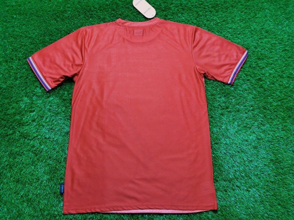 Uwielbiamy projekty ze zwierzęcymi akceptami, dlatego musieliśmy zdobyć dla Was tę koszulkę. Trudno nie zauważyć zwierzęcia umieszczonego na przedniej części trykotu. Z naszych ustaleń wynika, że jest to oryks, czyli rodzaj antylopy. Producent fajnie pomyślał i pożyczył oryksa z herbu klubu. Następnie powiększył go tworząc przepiękny ten projekt. Zwierzę bardzo ładnie wyróżnia się na tle czerwonego tła i elementów, które mogą przypominać góry.