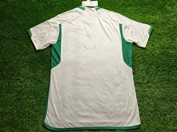 Wyglądem koszulki nawiązują do tych, w których Algierczycy występowali na Mistrzostwach Świata 1982. Wtedy na koszulkach mieli pionowe pasy. We współczesnej wersji, stały się one bardziej dynamiczne, by dostosować się do panujących trendów. Tak oto powstał design współczesny oparty na historii. Dodatkowo, na prawej piersi, w kolorze koszulki, producent umieścił dodatkowy herb. To właśnie on widniał na mundialu 82'. Choć... nie zawsze. W pamiętnym wygranym meczu z Niemcami, w pierwszej połowie Algieria nosiła koszulki z dużym napisem na klatce piersiowej, żeby na drugą część meczu wybiec na boisko właśnie z tym herbem.
