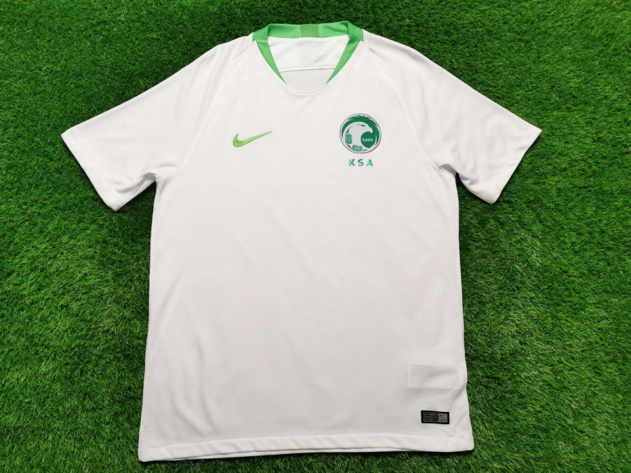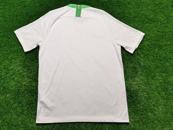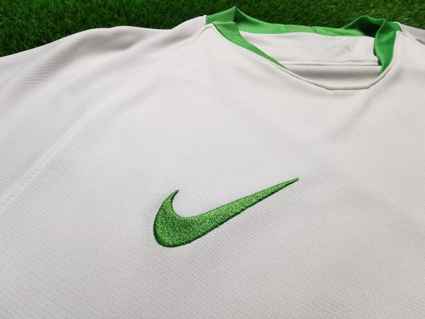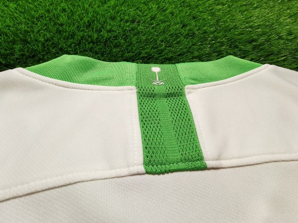 Ten projekt koszulki to charakterystyczny design dla domówki Arabii Saudyjskiej, czyli połączenie bieli z zielonymi wstawkami. Fajnie, że producent dopasował kolorystycznie swoje logo pod barwy reprezentacji. Typowy kołnierz tworzony przez Nike w latach 2018/19 tutaj został wzbogacony w identyczną palmę, jak ta znajdująca się w godle kraju. Warto podkreślić piękne wykonanie herbu. Zdjęcia tego nie oddają, ale pod wpływem promieni słonecznych mieni się on zmieniając swoją barwę.