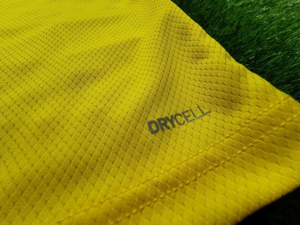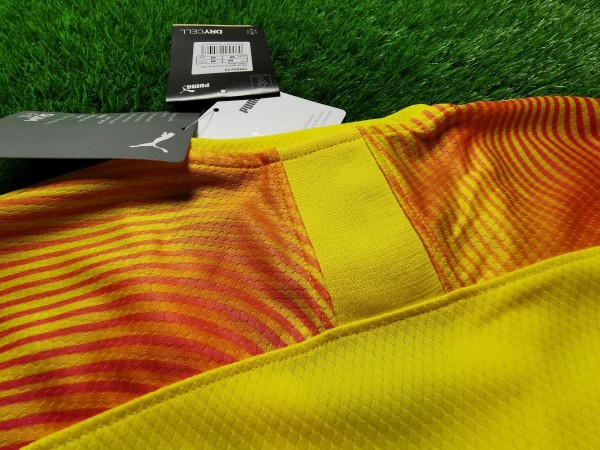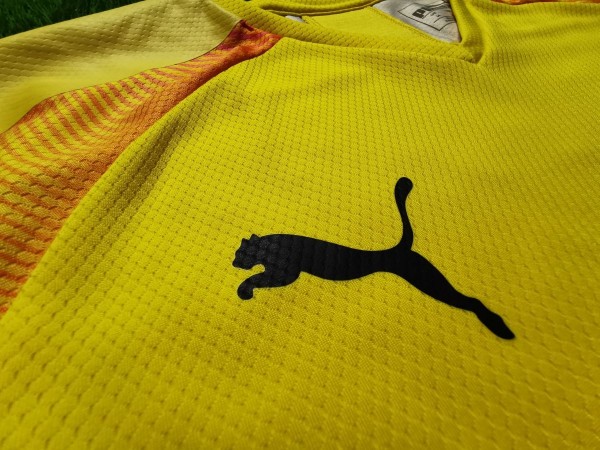 Koszulka jest dość dziwna w swoim wykonaniu - ciężka jak na meczówkę, tym bardziej od Pumy, która przyzwyczaiła nas do pięknych meczówek. Tu ciężaru dodają paski na ramionach, które skrywają szalony wzór. Mają jeszcze jedną funkcję - wyłaniają logo producenta, które jest wycięte i prezentuje się w pełni barw materiału spod pasków. Rewelka!