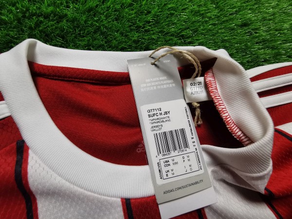 Domowa koszulka Sheffield United z sezonu 2021/22 została utrzymana w tradycyjnych barwach dla tego klubu. Na froncie trykotu znajdują się naprzemiennie występujące biało-czerwone poziome pasy. Zarówno kołnierzyk jak i rękawy zostały zakończone białą obramówką. Ciekawym akcentem jest pojawienie się na tylnej części kołnierza tarczy z dwoma krzyżującymi się szablami oraz napisu "BLADES". Symbol ten nawiązuje do przydomku klubu, jakim są właśnie "Szable".