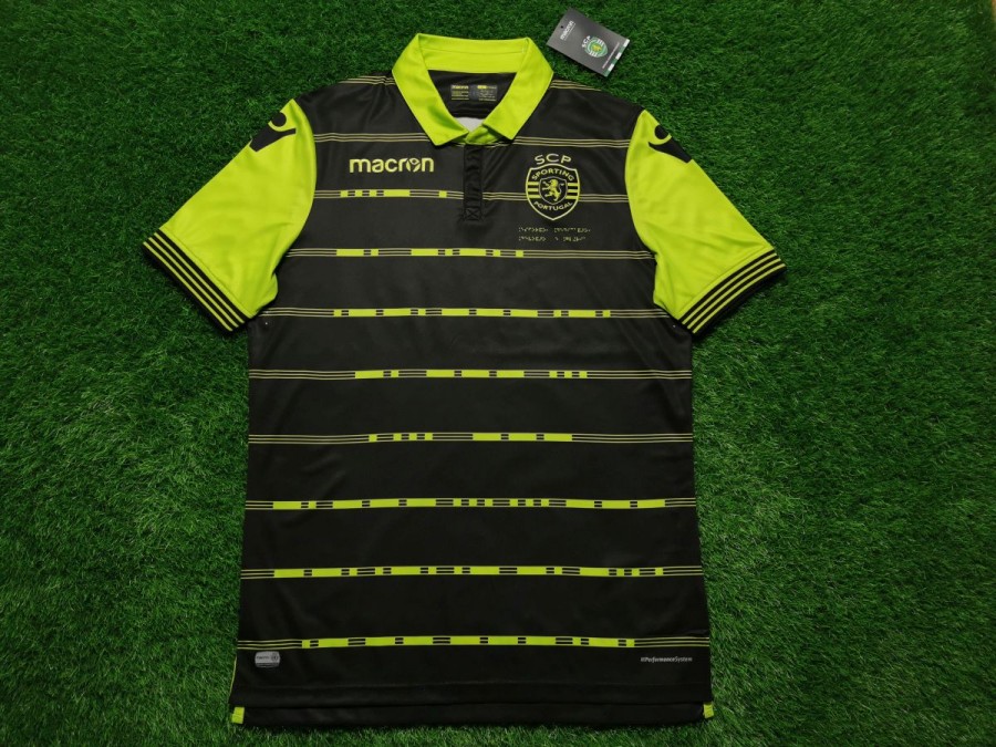 Na pierwszy rzut oka wyłania się zakodowana alfabetem Morse'a przyśpiewka fanów Sportingu. Motyw ten jest przewodnim tego trykotu, ale nie jedynym. Kolejny smaczek znajduje się pod herbem klubu. Tam zdecydowano się użyć, alfabetu Braille'a. Wiele miejsc pisało, że Macron zdecydował się umieścić w tym miejscu nazwę klubu, ale... nie jest to prawdą. Jest to motto klubu, które po portugalsku brzmi: "Esforço Dedicação Devoção e Glória", czyli "Wysiłek Poświęcenie Oddanie i Chwała".
