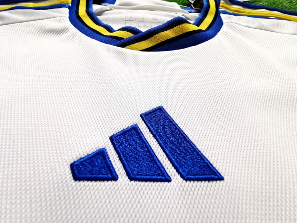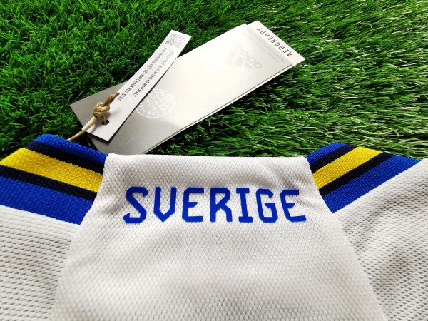Piękna klasyczna wyjazdowa koszulka reprezentacji Szwecji. Centralne ułożenie emblematów nadało projektowi przyjemnej symetrii. Wykończenia zaś zostały pokolorowane w barwy narodowe. Żółto-niebieskie paski adidasa na ramionach, kołnierz czy zakończenia rękawów, są niczym szczypta stylu i elegancji z podkreśleniem przynależności narodowej.